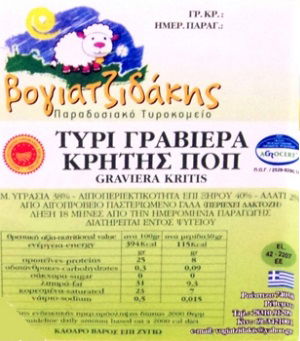 Γραβιέρα ΠΟΠ Κρήτης Βογιατζιδάκη. Γραβιέρα ΠΟΠ 6μηνης τουλάχιστον ωρίμασης με πιστοποίηση, σε vacuum. Με χαρακτηριστική πλούσια πικάντικη γεύση. Προϊόν ζυγιζόμενο. Τιμή κιλού: €17,48. ΠΡΟΪΟΝ ΨΥΓΕΙΟΥ: ΓΙΑ ΑΓΟΡΑ ΕΝΤΟΣ ΚΑΤΑΣΤΗΜΑΤΟΣ ή ΔΙΑΝΟΜΗ ΜΕ ΔΙΚΟ ΜΑΣ ΜΕΣΟΝ.